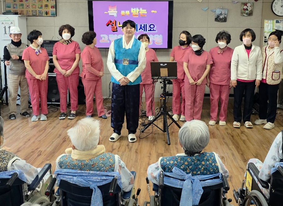 2026년 새해를 맞이하여 고령영생요양원 원장님 이하 직원들이 함께 모여 어르신들께 새해 인사를 드리는 시간을 가졌습니다. 직원들은 정성스러운 마음으로 어르신들께 세배를 드리며 “늘 건강하시고 새해 복 많이 받으십시오”라는 덕담을 전했습니다. 어르신들께서는 환한 미소로 화답하시며 따뜻한 덕담을 건네주셨고, 서로의 건강과 행복을 기원하는 훈훈한 분위기가 이어졌습니다. 이번 행사를 통해 직원들은 어르신을 공경하는 마음을 다시 한 번 되새기는 계기가 되었으며, 어르신들께서는 존중받고 사랑받는다는 마음을 느끼시는 뜻깊은 시간이 되었습니다. 새배 후 신나는 공연이 이어졌습니다.