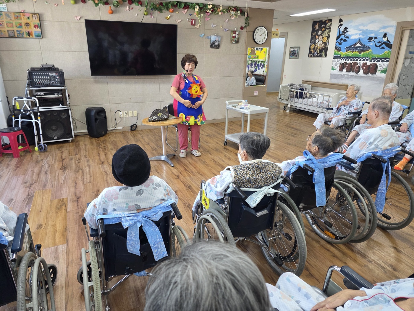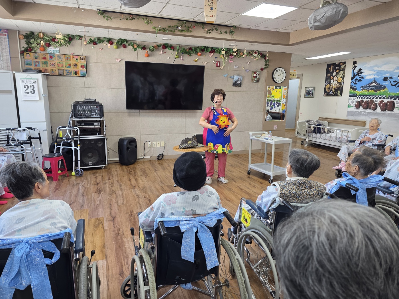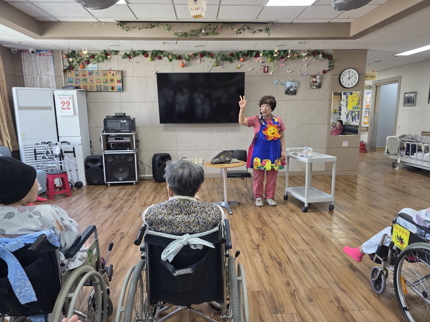 본 요양원 선생님께서 어르신들에게 인지 쑥쑥 재미있는 동화를들려주십니다 오늘은 봄날 꼬꼬닭과 병아리까지 챙겨오셔서 멋진 동화를 도움주셨습니다.