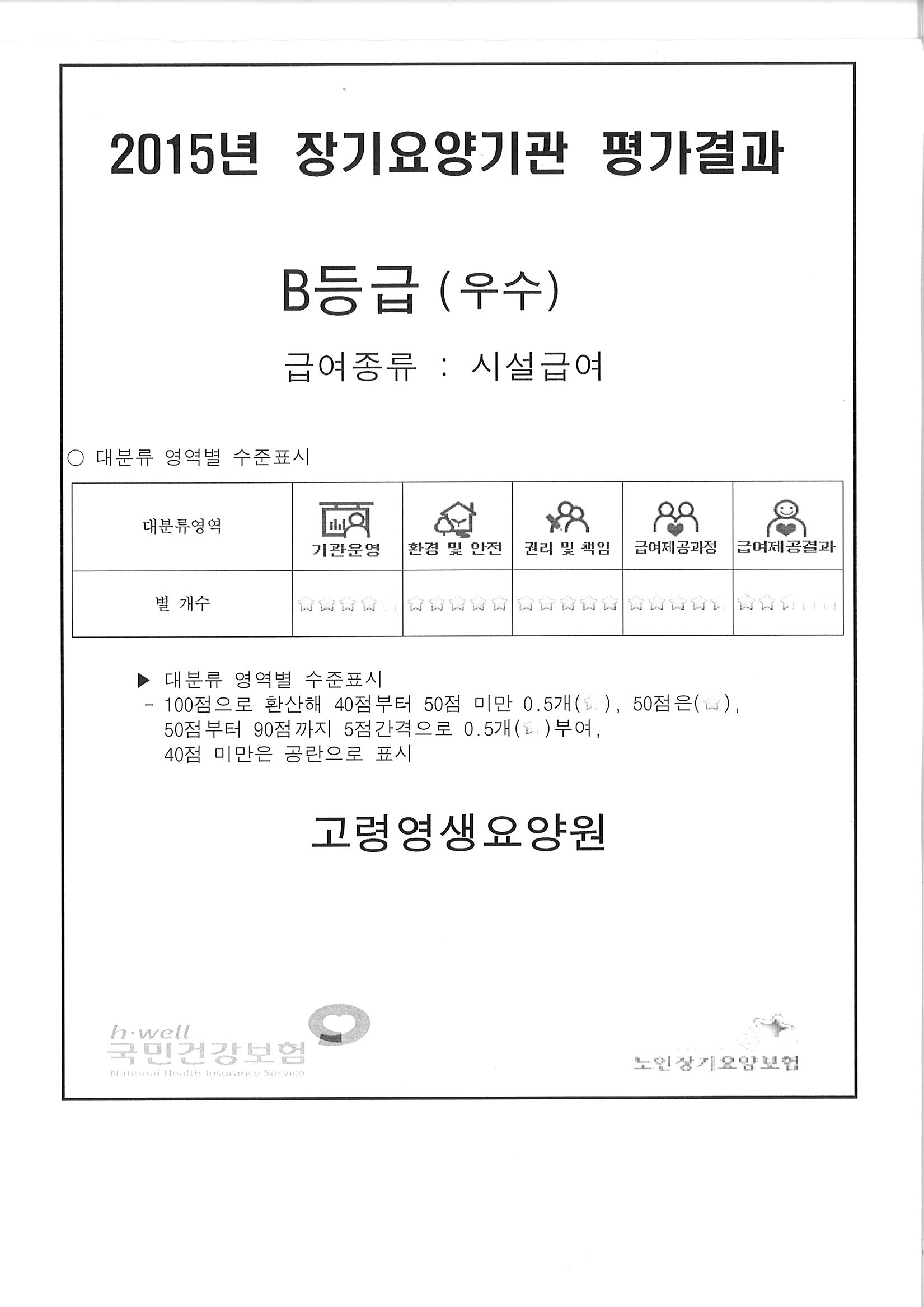 고령영생요양원이 2015년 장기요양기관 평가결과 '우수'에 해당하는 B등급을 받았습니다. 이는 전체 평균 73.77점을 넘어선 것으로 B등급에 해당하는 점수입니다. 그동안 2년마다 평가를 실시한 본 원은 개정된 3년뒤 평가에서도 더욱 좋은 결과를 얻을 수 있도록 어르신 섬김에 최선을 다하겠습니다. |
